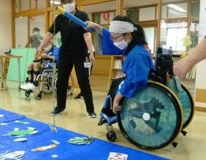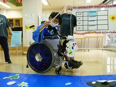 ゲームでは、みんなができて楽しい内容をと考えました。縁日の金魚すくいをイメージして釣りゲームを行いました。釣るものは、魚だけでなく