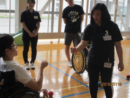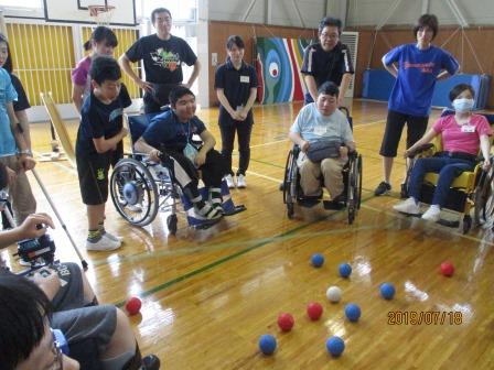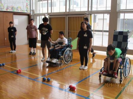 7月18日(木)、東北文教大学の学生の皆さん3名が来校し、高等部の生徒13名と一緒に「ボッチャ」という障がい者スポーツの競技で交流しました。
