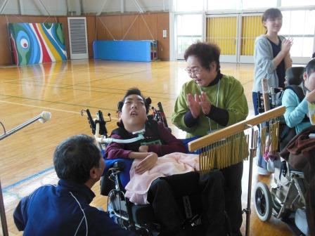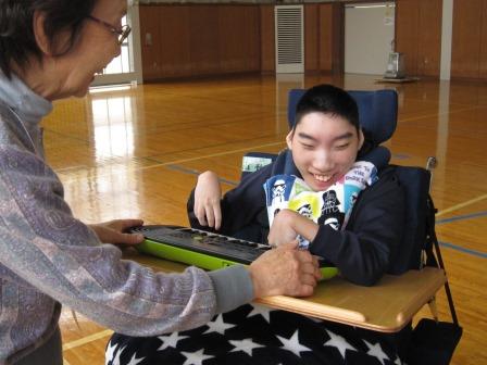 9月26日(木)、小学部の児童10名が、地域の方8名と音楽活動で交流しました。一緒に手遊び歌をしたり、花笠音頭を踊ったりして交流しました。